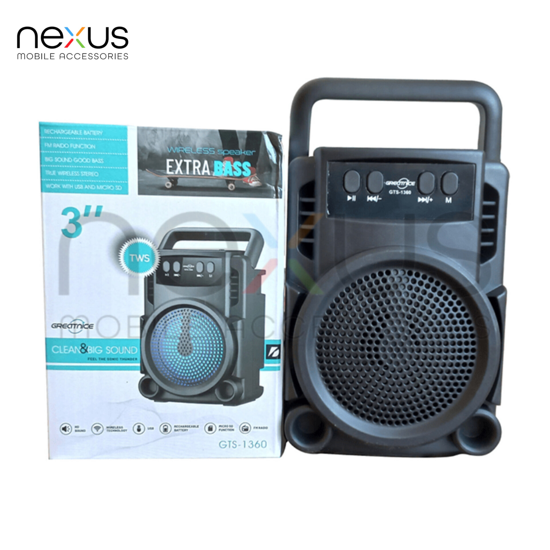 ظاهر این دستگاه یکی از نقاط قوت بزرگ آن می باشد. در عین حال که به فاکتورهایی مانند قیمت و کیفیت برای طراحی این محصول توجه شده، دقت به جزئیات در آن کم نشده است و سازندگان بدون توجه به این موارد آن را روانه بازار نکرده اند.در نگاه اول به GTS-1360 3inch Bluetooth speaker، توجه شما معطوف به باند بزرگ آن و نوری که در پس زمینه اش دیده می شود، خواهد شد اما کمی بعد متوجه دستهی بسیار زیبا و کارآمد آن و دکمه هایش می شوید.دسته این اسپیکر بلوتوث به نحوی طراحی شده است که به شما در حمل آن کمک کند، همچنین این دسته به یک جهت قابل تا شدن است. زیر دسته و روی سطح باند درگاه های ورودی دستگاه اعم از SD Card، USB، ورودی شارژر و دکمه روشن و خاموش کردن آن قرار دارد.کمی پایین تر، زیر درگاه های ورودی، دکمه های کلاسیک و خوش دستی برای جلو و عقب کردن موسیقی، کم و زیاد کردن صدا، تغییر مود آهنگ و البته play و متوقف کردن آن قرار گرفته است.در کنار این بخش شیارهای کوچکی برای خروج صدای اسپیکر و زیر آن نیز بلندگویی بزرگ با پس زمینه ای از رقص نور با قابلیت تغییر رنگ قرار دارد.