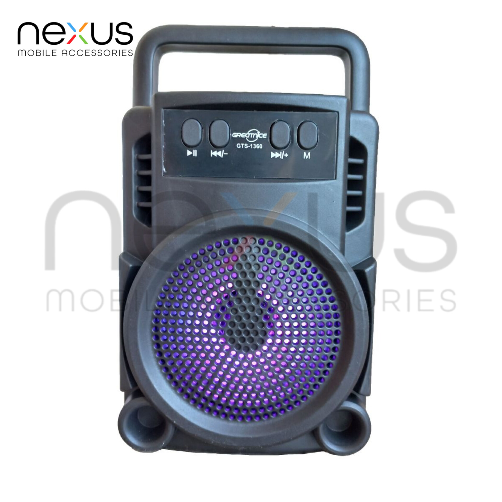 ظاهر این دستگاه یکی از نقاط قوت بزرگ آن می باشد. در عین حال که به فاکتورهایی مانند قیمت و کیفیت برای طراحی این محصول توجه شده، دقت به جزئیات در آن کم نشده است و سازندگان بدون توجه به این موارد آن را روانه بازار نکرده اند.در نگاه اول به GTS-1360 3inch Bluetooth speaker، توجه شما معطوف به باند بزرگ آن و نوری که در پس زمینه اش دیده می شود، خواهد شد اما کمی بعد متوجه دستهی بسیار زیبا و کارآمد آن و دکمه هایش می شوید.دسته این اسپیکر بلوتوث به نحوی طراحی شده است که به شما در حمل آن کمک کند، همچنین این دسته به یک جهت قابل تا شدن است. زیر دسته و روی سطح باند درگاه های ورودی دستگاه اعم از SD Card، USB، ورودی شارژر و دکمه روشن و خاموش کردن آن قرار دارد.کمی پایین تر، زیر درگاه های ورودی، دکمه های کلاسیک و خوش دستی برای جلو و عقب کردن موسیقی، کم و زیاد کردن صدا، تغییر مود آهنگ و البته play و متوقف کردن آن قرار گرفته است.در کنار این بخش شیارهای کوچکی برای خروج صدای اسپیکر و زیر آن نیز بلندگویی بزرگ با پس زمینه ای از رقص نور با قابلیت تغییر رنگ قرار دارد.