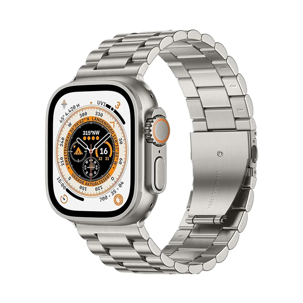 این مدل طراحی مشابه سری های اولترا اپل واچ دارد و همراه خود ۷ بند متنوع ارائه میدهد که باعث شده بتوانید براحتی استایل دلخواهتان را انتخاب کنید. یکی از بندهای موجود در این مجموعه از نوع رولکسی است که ظاهر رسمیتر و جذابتری به ساعت میدهد و برای استفاده در محیط های کاری یا مهمانیها مناسب است.